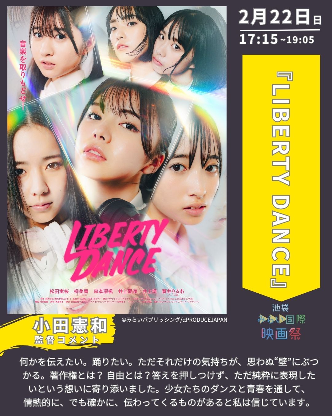 「何かを伝えたい。踊りたい。ただそれだけの気持ちが、思わぬ“壁”にぶつかる。著作権とは? 自由とは? 答えを押しつけず、ただ純粋に表現したいという想いに寄り添いました。少女たちのダンスと青春を通して、情熱的に、でも確かに、伝わってくるものがあると私は信じています。」