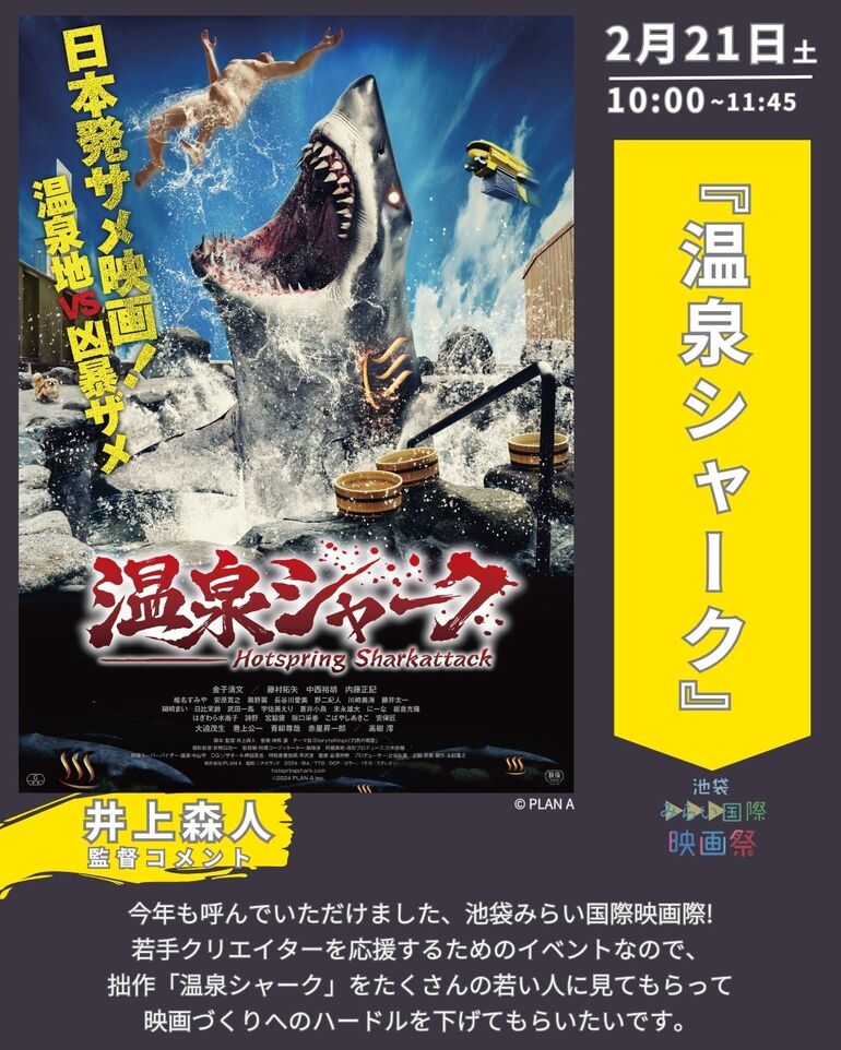 第一弾は、前回も上映した、映画『 #温泉シャーク 』前回はなんと、『温泉シャーク2』の発表も、当映画祭で行われた!今回も盛り上がる事間違いなし!クラファンで支援をして、1月中旬頃の予約開始を待っていてくれ!サメのワナかもしれないが、、